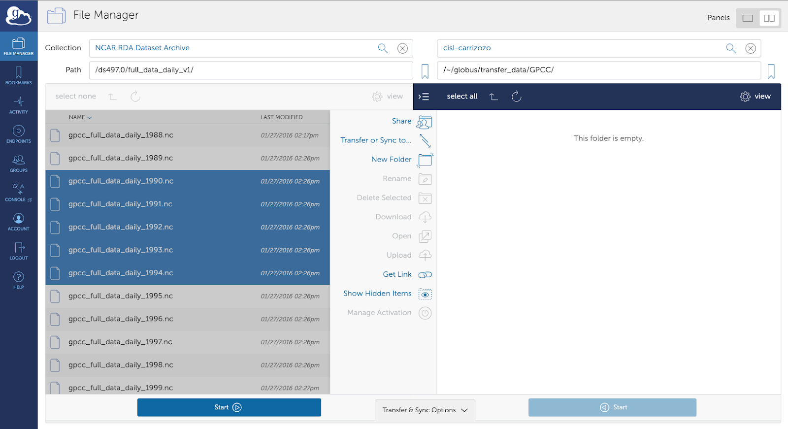Globus (globus.org) can be described in the simplest terms as a third-party data transfer service, and provides a fast, secure, and reliable method for transferring large data volumes. Data transfers are carried out using the GridFTP protocol and are facilitated by a Globus Connect server running on an IBM cluster housed at NCAR.Step-by-step instructions on how to create a Globus account and transfer files are available on the Globus website. To initiate a transfer, a user defines two endpoints—one origination endpoint and one receiving endpoint—and then submits the transfer task to Globus. Once a data transfer job has been started, Globus takes care of the rest, including processing the transfer and monitoring its performance and progress. After the transfer completes, Globus sends you an e-mail notification with a report detailing the transfer statistics and performance.